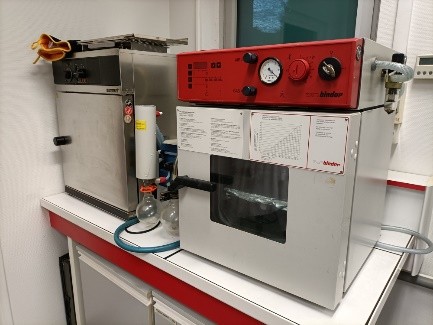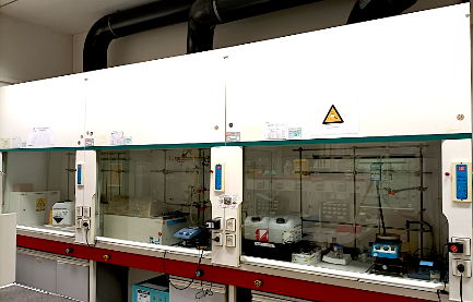La salle de synthèse chimique est pourvue de plusieurs sorbonnes, chacune dédiée à un type de manipulation : une sorbonne pour la manipulation des acides et bases, une pour les synthèses en conditions désoxygénées et en température, une autre pour la purification des polymères (montages Soxhlet, évaporateur rotatif) et enfin une sorbonne pour la synthèse des nanomatériaux. L’eau déionisée est également accessible dans cette salle, ainsi que des stocks de solvants courants (éthanol, acétone). Des (micro-)balances, des fours sous vide et centrifugeuses sont aussi présents dans la salle, pour la préparation et la purification des matériaux.