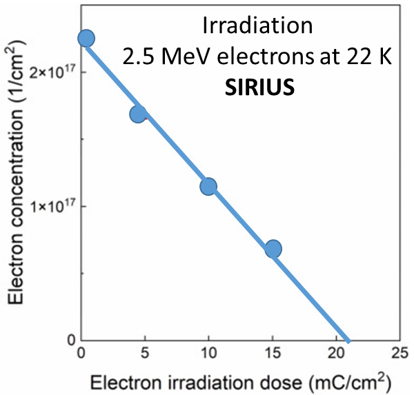 Les défauts ponctuels peuvent agir comme des sites donneurs ou accepteurs ; leur génération peut donc modifier la nature n ou p du semi-conducteur et, dans certains cas, impliquer l’inversion d’un type à l’autre. Alors que la quantité de défauts est contrôlée par la fluence, le type de défaut générée peut être contrôlée par l’énergie du faisceau d’électrons utilisé pour irradier le matériau. Un tel degré de liberté est très important car différents types de défauts possèdent une nature différente (donneur ou accepteur), offrant ainsi aux chercheurs la possibilité de sélectionner les typologies qu’ils souhaitent induire dans le matériau afin de l’adapter à une application spécifique. Le β-Ga₂O₃ est un matériau intéressant à très large bande interdite, mais l’une des principales limitations à son utilisation est qu’il est toujours produit de type n. L’irradiation électronique a démontré la possibilité d’induire efficacement la conversion n-type isolant par la création de lacunes de Ga [1].