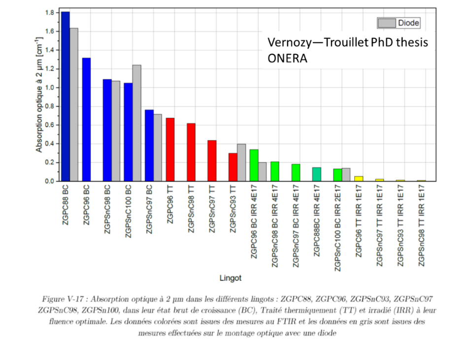Les transitions entre les niveaux énergétiques de défauts peuvent générer la présence d’activités d’absorption (et d’émission) à des énergies inférieures à celle de la bande interdite. Bien qu’une augmentation de l’absorption soit observée après irradiation, l’utilisation de l’irradiation peut également induire le blanchiment des défauts natifs absorbants (défauts générés lors de la production du matériau). Le ZnGeP₂ est considéré comme un matériau très prometteur pour l’optique non linéaire. L’une des limites à son utilisation est la présence, dans l’échantillon tel que produit, d’absorptions aux longueurs d’onde de pompage. L’irradiation s’est révélée efficace pour éliminer cette absorption indésirable [2] et, utilisée en combinaison avec d’autres traitements du matériau, elle permet d’atteindre un coefficient d’absorption très faible.